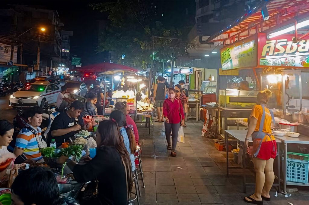 While guidebooks highlight large, souvenir-filled night markets, locals favor smaller, food-focused spots. Royal City Avenue, a popular nightlife district with nightclubs, karaoke bars, and entertainment venues, offers vibrant nighttime fun beyond food markets.